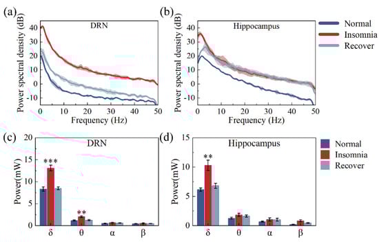 Statistics for PSD and power of rats’ dorsal raphe nucleus (DRN) and hippocampus of rats in normal, insomnia and recovery states (n = 12). (a) PSD statistics in DRN; (b) PSD statistics in hippocampus; (c) Power statistics in the DRN; (d) Power statistics in the hippocampus. δ: 0–4 Hz; θ: 4–7 Hz; α: 8–12 Hz; β: 13–30 Hz. (** p < 0.01, *** p < 0.001, compared to normal in the same brain region).