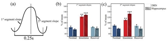 The spikes’ action potential was divided into three parts: depolarization, repolarization, and hyperpolarization. The spike duration in this study was defined as the time of repolarization. The DRN spike duration did not change significantly, and the spike durations were 0.33, 0.36, and 0.30 s in normal, insomnia, and recovery rats, respectively. The hippocampal spike duration (0.34 s) in insomnia rats was much smaller than normal (0.40 s) and recovered rats (0.39 s). The repolarization slopes of the DRN spikes in the three states were 318.18 ± 26.39, 176.16 ± 15.41, and 340.56 ± 32.02. The repolarization slopes of the hippocampal spikes in the three states were 317.50 ± 26.83, 163.24 ± 17.5, and 282.69 ± 27.98 (Figure 7d).