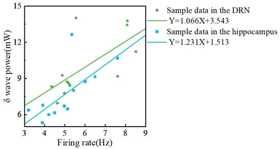 Our results showed a positive proportional relationship between the firing rate and δ wave power. As shown in Figure 10, the slope of the fitted line was 1.066 for the DRN, whereas the slope of the fitted line was 1.231 for the hippocampus.