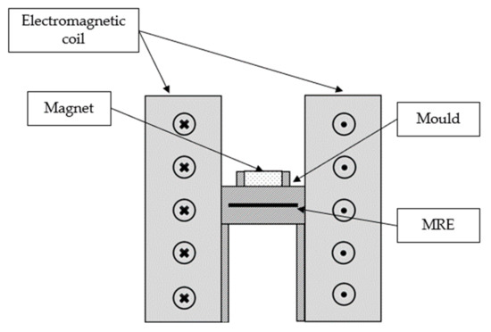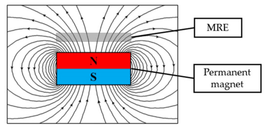 The important parameter in producing the diverged, fountain-like particle chain alignments inside the MRE was by controlling the direction of magnetic flux density that penetrated in the samples during the curing process. Figure 1 shows the concept of MRE’s placement in a mold with induced magnetic flux density to the sample during the curing process. The figure illustrates the position of MRE in which the lines of magnetic flux densities would be a guidance for the CIPs to align during the pre-structuring process and the concept would be dependent on the strength of magnetic flux density that passed through the uncured MRE. The particles that would be rearranged along the directions of magnetic flux density was attributed to the magnetic interactions between the particles. Hence, the strength of the magnetic field was one of the major requirements in fabricating the anisotropic MREs as the alignment of magnetic particles in the silicone matrix would depend on the magnetic field strength [37].