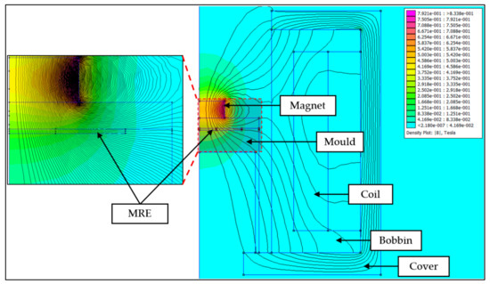 Based on the design, the magnetic flux and lines produced were studied through finite element analysis by utilizing open-source software FEMM 4.2. The illustrations of the magnetic flux flow within the set-up coil were depicted in Figure 2. The simulation was conducted in a 2D axis-symmetry mode which showed half of the cross-sectional area that would actually represent the whole set-up system. In the FEMM software, each material with its magnetic properties was arranged accordingly as in the simulation. The non-magnetic mold was sandwiched between the metal cylinders to allow greater magnetic flux density to flow throughout the mold. The current was set at 1 A to produce minimum 0.2 T of magnetic flux density that would cross the mold, and to drive the CIPs to align within the matrix of MRE. Figure 3 shows the prediction of magnetic field and magnetic flux density generated within the set-up apparatus and its distribution in the uncured MRE.
