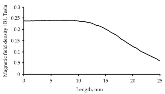 Meanwhile, the MRE with a fountain-like arrangement was predicted by adding a disc-shaped permanent magnet over the mold. The adding of the permanent magnet as a ‘pick-up’ component was to pick up the generated magnetic force by the magnetic coil; thus, it would produce curved magnetic lines as in Figure 1. The curved magnetic flux lines also would lead to the CIP alignments in the MRE. In fact, Figure 4 shows the results of simulation, indicating the amount of magnetic flux density that passed through the sample during the curing process. The results of the aligned particles then would be validated via morphological observation.
