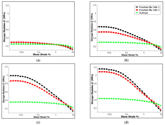 The strain amplitude sweep test was performed in order to explore the effect of shear strains on the dynamic viscoelastic modulus of the MREs. The test was carried out by varying the amplitude strains from 0.01 to 10%, with a constant frequency of 1 Hz, and at room temperature of 25 °C. Figure 6 shows the storage modulus versus shear strain for the isotropic MRE and fountain-like MRE of Side-1 and Side-2. It is known that the MRE Side-2 has the opposite particle-chain alignment of MRE Side-1. Each of the MRE samples was tested under different magnetic fields, particularly 0, 0.2, 0.4 and 0.6 T for Figure 6a–d, respectively. In brief, all the MRE samples exhibited a strain-dependent behaviour, in which the shear storage modulus would decrease with the increase of strain amplitudes, at a specific constant magnetic field.