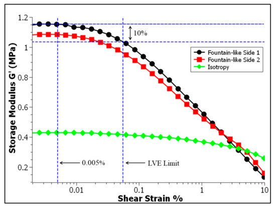 Figure 7 shows the approach of the determination LVE region, which is outlined as the function of storage modulus against the shear strains, particularly at the 0.6 T. A single LVE limit of all MRE samples would be determined for further use of other tests such as frequency sweep and magnetic field sweep tests that require a set of constant strain [14,45]. In this study, the LVE limit was determined based on the finding of fountain-like Side-1 MRE since it has the shortest LVE region, as it would cater to the LVE region of other MRE samples as well. Based on Figure 7, the LVE limit is determined based on the 10% downturn pattern from the plateau of the storage modulus [45] and respective to the projection line; the selected constant shear strain is around 0.005%. The selected value for set constant strain, however, is still under the range of LVE limit for all conditions. This ensures that the sample will revert to its original state upon deformation during any test.