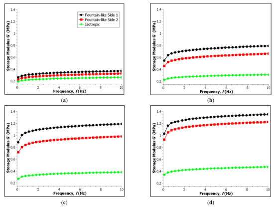 On the other hand, under the on-state conditions from 0.2 to 0.6 T, particularly in Figure 6b–d respectively, the fountain-like MRE samples show a significant increment in storage modulus as compared to the isotropic MRE. In fact, the response of the storage modulus for Side-1 came out higher than the Side-2, suggesting that the influence of the particle alignments towards the magnetic field is stronger on Side-1 compared to Side-2. Initially, both sides have an identical storage modulus as shown in Figure 6a. However, with applying magnetic fields and an increase from 0.2 to 0.6 T, both fountain-like MREs became stiffer. For instance, at 0.2 T, the storage modulus of Side-1 and Side-2 are 0.67 and 0.55 MPa, respectively, compared to 0.29 MPa for both sides in the off-state condition. The values are then further increased with the increment of applied magnetic fields at 0.4 and 0.6 T. Nevertheless, the difference in storage modulus between both sides of fountain-like MREs, at a specific magnetic field, becomes lower, indicating that the MRE samples are said to approach its saturation value of storage modulus with increasing magnetic fields, as indicated in Figure 6b–d. This resultant behavior also demonstrated the influence of magnetic field strength towards the CIP–CIP interaction in the MRE samples.