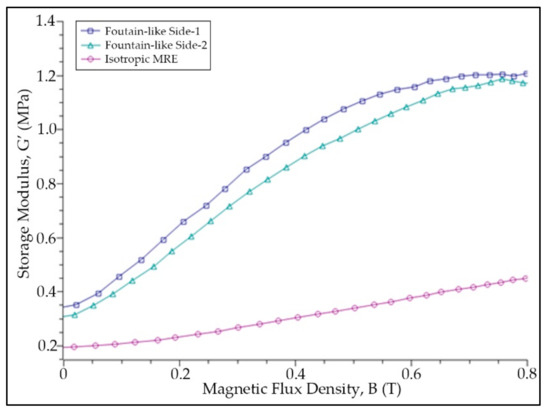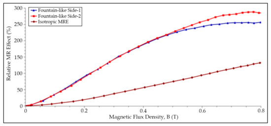 The relationship between the storage modulus of MRE samples at different magnetic field values was measured and presented in Figure 9, while Figure 10 represents the relative MR effect of MRE samples that projected from Figure 9. As observed, all the MRE samples exhibit a similar pattern as the shear storage modulus increased with the increasing magnetic fields. The MREs are said to become stiffer with magnetic fields. This is a typical phenomenon in MRE in which, when a magnetic field is applied to the MRE, the magnetic dipole moment of the CIPs within the matrix is induced. Hence, more energy is required to break the magnetic forces between the particles, causing the shear modulus of MRE to change and enhance [11]. As presented in Figure 9, the storage modulus for fountain-like Side-1 MRE was slightly higher than the fountain-like Side-2, followed by the isotropic MRE. Since the fountain-like MRE Side-1 has a stronger interaction between the particles, the elastomer composite appears to be stiffened more than the Side-2, even at the initial state. Nonetheless, both storage modulus of fountain-like Side-1 and Side-2 MREs increased almost at the same rate, up to 0.5 T as indicated in Figure 9 and Figure 10. Then, with a further increase in a magnetic field up to 0.8 T, the increment behavior in the storage modulus of both fountain-like MREs shows a different trend. In particular, the Side-2 MRE demonstrates a further increase in storage modulus, which is contradictory to the Side-1 MRE that shows a fading increment in storage modulus, indicating the saturation state of the Side-1 MRE with higher applied magnetic fields. In other words, the fountain-like Side-1 MRE has achieved its saturation stage of storage modulus quicker than the Side-2 MRE. Subsequently, both lines of storage modulus are approaching one another, as presented in Figure 9. In general, at higher values of magnetic fields, particularly more than 0.8 T, the CIPs would achieve its maximum magnetization; therefore, a further increase in the magnetic field values might not affect the improvement in the properties of MRE.