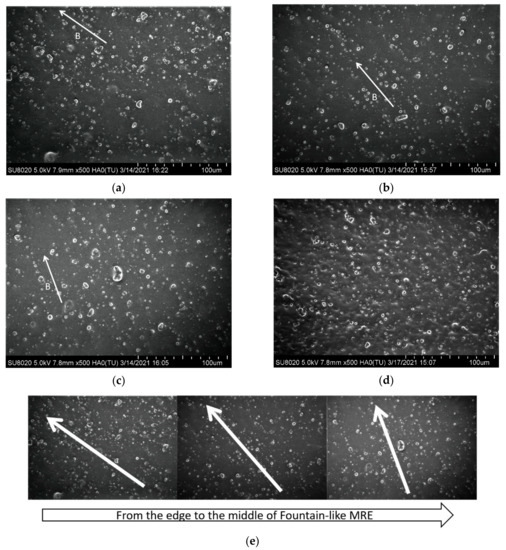 Figure 12a–c present the surface morphologies of fountain-like MRE; particularly, Side-1 corresponded to regions A, B and C, respectively, as indicated in Figure 11. Meanwhile, Figure 12d shows the isotropic MRE and Figure 12e is the combined images of Figure 12a–c. It can be observed that, from edge (a) to the center of the sample (b), the particle chains of the CIPs showed the changing angles, approaching 0° to the y-axis, indicating the fountain-like shape of the particle’s arrangement in the MRE. The distribution and arrangement of CIPs also correspond to the magnetic field directions as controlled by the designed mold and predicted via FEMM analysis, as discussed in Section 2.2. The interaction and attraction among the CIPs caused them to align following the flow of magnetic fields when it was applied to the MRE melt during the curing process. In the curing device, the utilization of permanent magnets in the curing apparatus has an impact on the CIP chains’ formation since it acts as a pick-up magnetic field that caused the formation of fountain-like lines of magnetic flux density in the curing mold. Meanwhile, around 0.2 T of applied magnetic field has guided the CIPs to align along the curved magnetic flux lines, resulting in the fountain-like shape of the CIP alignment. The CIPs got fixed and trapped in the elastomeric matrix in the form of fountain-like chains upon the curing process, producing Fountain-like Side-1 MRE. On the other hand, the isotropic MRE as in Figure 12d shows the scattered CIPs as the melt MRE was cured without the presence of the magnetic field, leading to randomness locked CIPs in the matrix phase.