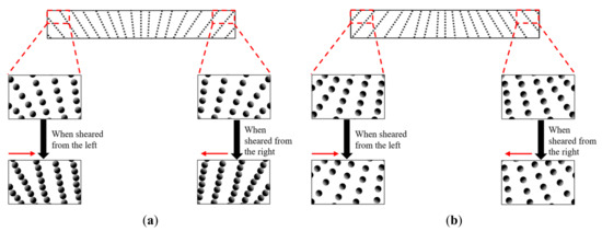 It is well known that the particle distribution is one of the important parameters that led to the changes in the rheological properties of MRE, particularly on the resultant stiffness and MR effect. Due to fountain-like alignment of CIPs in the MREs, some changes of the particle–matrix interactions during the shearing force were expected to occur as some particle’s arrangement might be expanded and some were compressed, respective to the direction of applied shear stress. The schematic diagram of the fountain-like MREs and the CIPs behavior during the applied shear stress are depicted in Figure 13. In particular, Figure 13a demonstrates the changes of particle chains when the Fountain-like Side-1 MRE was sheared oscillatory, from left to right and vice-versa. Either way, the shear deformation has compressed the particle chains as the CIPs that were arranged in the fountain-like shape looked as if they were opposing the applied shear stress. Accordingly, the gap between the particles were observed to be reduced, and the compressed CIPs have led the MRE to slightly resist deformation, thus enhancing the stiffness of the MRE. The effect also caused the shear stress to be increased, simultaneously increasing the storage modulus of the MRE. The similar result has been explained by Zhang et al. [34] who stated in their theoretical modelling that, when the average distance between the particles was reduced, the shear stress of the material would be increased. On the contrary, the shear stress that was applied onto the Fountain-like Side-2 MRE would cause the particle chains to be expanded as the CIPs that were arranged in such manner would have less opposition to the applied shear stress. The effect also caused the gap between the CIPs to increase, causing the MRE to deform slightly easier, as indicated in Figure 13b. As a result, the fountain-like Side-2 MRE performed slightly lower storage modulus as compared to fountain-like Side-1 MRE, as has been discussed in previous sections. Anyhow, both fountain-like MRE samples exhibited higher storage modulus as compared to the isotropic MRE as the aligned CIPs have possessed a closer gap between the particles and stronger magnetic forces, especially when there is the presence of magnetic fields. This phenomenon has driven the stiffness of MREs to be increased accordingly and perhaps the proposed fountain-like CIPs in the MRE would cater to shear stress in both directions, which resulted in improved distribution viscoelastic properties of MRE, on both sides during the applied stress.