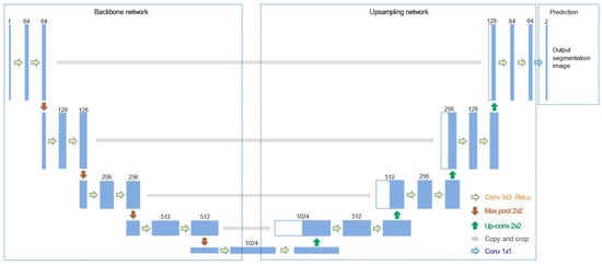 - Structure: The structure of UNET can be divided into two parts (Figure 4). The first half of the UNET is the backbone feature extraction network. VGG16 [26] was chosen for feature extraction, which is a stack of convolution and maximum pooling operations. A feature layer with a new scale can be acquired after each pooling, resulting in five feature layers with distinct scales. The up-sampling part takes up the second half. The five feature layers were merged through the up-convolution method to produce an effective feature layer that contains all the features. The category of each pixel can be predicted according to the last obtained effective feature layer.