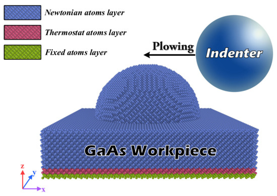 Many scholars have worked in different directions in the study of atomic and close-to-atomic-scale manufacturing, which also includes extensive experiments and simulations of AFM indentations and scratches [8,9,10,11,12]. In addition, some scholars have conducted a more detailed MD study on the deformation behavior of GaAs. However, all existing studies focus on the case of smooth surfaces, conducting MD simulations of the cutting process of GaAs on smooth surfaces to explore a series of phenomena in the deformation process [13,14,15]. In fact, from a microscopic point of view, the indenter is in contact with the coarse surface, both in the actual contact case of power devices and in the scratching experiments [16]. In contrast, the importance of asperity GaAs in the scratching behavior for the underlying micromechanical response has long been neglected. For example, in MD simulations of crystal deformation, the deformation behavior of a roughened workpiece is significantly different from that of a flat workpiece [17]. Therefore, existing studies remain poorly understood on the effect of the mechanical loads’ frictional behavior in plowing on the microscopic deformation of the single asperity GaAs. There is still not enough evidence to firmly explain the range of physical phenomena in the deformation process. Moreover, the microscopic deformation mechanisms are not yet fully understood [14,18].