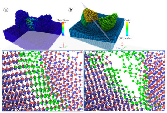 Screenshots of the extension of the cracks. (a) shows the distribution of atomic shear strain at 12 nm plowing distance, at which point (b) shows the workpiece in a polycrystalline state, with the translucent (111) fracture surface being the dissociated surface of the GaAs. (c,d) show the evolution of the atomic structure of the crack formation process at 11 nm and 12 nm plowing distances, respectively.