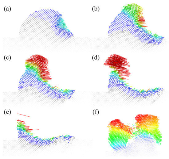 Atomic displacement vector diagram in different plowing stages; (a–e) represent the plowing distance of d = 4 nm, 7 nm, 9 nm, 12 nm and 14 nm. Additionally, (f) shows a view of the crack plane at 12 nm distance, demonstrating the trajectory of the atoms on either side of the crack. The direction of the arrow indicates the moving direction of atoms and the color of the arrow indicates the magnitude of the displacement.