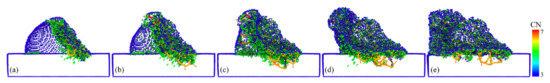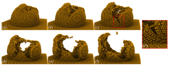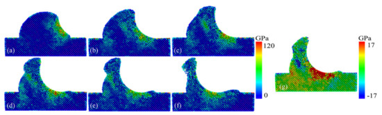 In order to observe the complex stress state of the cracking behavior of the rough peak surface, we described the state of the von Mises equivalent stress during the deformation of the model and the hydrostatic stress distribution at the maximum tensile stress, respectively. The von Mises stress distribution is suitable for evaluating the inelastic deformation behavior of local atoms and can be used to analyze the most dangerous areas [33]. From the analysis of the stresses within the spherical asperity, we knew that the high-stress region was first concentrated in part in contact with the indenter, as shown in Figure 6a. When the stress applied by the indenter exceeded the yield strength of the workpiece material, the material underwent plasticizing behavior. As the asperity was deformed, from Figure 6a–c, we observed that the atoms inside the asperity were subjected to an increasing degree and a range of stresses, continuously accumulating deformation energy. The stress distribution was divided into two central regions: the substrate region under the indenter and the rough peak region under the chips. As the indenter was pushed, a higher stress region appeared inside the rough peak, which gradually spread towards the opposite side of the surface, as shown in Figure 6b–e. Until the rough peak crack propagation event entirely occurred, all of the strain energy accumulated in the asperity immediately below the chips was released, as shown in Figure 6e,f. The atomic stress in the green region below the chips decreased to 0.