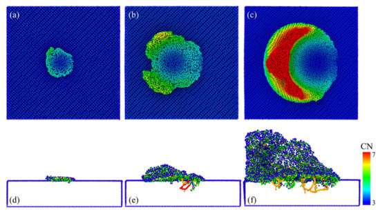 (a–c) and (d–f) represent the surface morphology at significant cracks and the defect structure at plow completion at asperity radii of 2 nm, 4 nm and 7 nm, respectively.