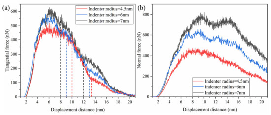 Figure 14 compares the variation of the tangential and normal forces for different indenter sizes. The force curves between indenter particles with different sizes had similar mechanical characteristics. However, for a larger indenter radius, the onset of plasticity occurred at higher forces. The smaller the indenter particle radius, the earlier it reached the initial yield point of the rough peak, and the faster the tangential force entered the stable fluctuation state. Accordingly, the larger the indenter radius, the smaller the moving distance to complete the plow of the rough body. Therefore, the platform length of the stable fluctuation of the tangential force decreased with the increase in the indenter radius, as shown in Figure 14a. Compared to the indenter with different particle sizes, the indenter with different particle sizes had an almost linear decline stage in the decline stage of tangential force. This stage existed between two straight lines of the same color in the figure, related to the stable development of cracks. With the decrease in indenter radius, a longer displacement distance was required to make the rough body produce cracks. Meanwhile, the smaller indenter bore higher stress and the crack propagation was completed first. Therefore, the length of the linear decline stage was also reduced. At the same time, the more minor indenter caused a more significant shear strain rate on the localized distortion in the lattice near the contact area. Therefore, with the decrease in the indenter radius, higher stresses accelerated crack propagation. The tangential force curve with the indenter radius of 4.5 nm had the fastest decline speed in the force decline stage, confirming this view. The maximum tangential force decreased much less rapidly than the normal force as the radius of the indenter decreased, indicating an increase in the dynamic friction coefficient. After this linear descent stage, the force curve had a gradual and continuous descent stage. A similar trend of the normal force curve also showed that the plowing process was relatively consistent under different particle sizes, as shown in Figure 14b.