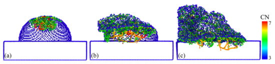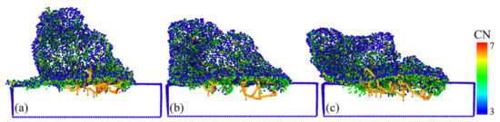 In order to investigate the effect of the indenter radius on asperity deformation, we selected three indenters of different sizes to conduct the simulations. We were convinced that changing the indenter size would affect the deformation behavior. Figure 12a–c shows the instantaneous atomic configuration after plowing with indenter sizes of 9 nm, 12 nm and 14 nm, respectively. At an indenter radius of 4.5 nm, the formed chip at the bottom of the advancing direction of the indenter had a more debris-like appearance, as shown in Figure 12a. It was well understood that there were more rough peak atoms on the moving track of the indenter after plowing, which was regarded as surface roughening. More rough peak atoms remained in their original position on the single plowing track borne by a single indenter, which meant that the surface had not improved. We knew that the smaller the indenter size, the lower the stress range and the higher the stress concentration. As the indenter size increased, the spacing of the cracks widened, while the fracture dominated by the primary cracks resulted in no chip formation ahead of the indenter tip.