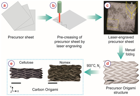 Nomex Type 410 insulation paper with a paper thickness of 130 μm was purchased from RS Components (Product number: 775–7466) and used as received. Whatman filter paper Grade 1 was used as the cellulose sheet and purchased from Sigma Aldrich (catalog number: WHA1001150). The process flow for the fabrication of carbon origami shapes is illustrated in Figure 1. We used the Miura-ori shape as the origami structure due to its shape-complexity and high interest in the engineering community [34,35,36,37]. The unit cell of a Miura-ori pattern is defined by the design parameters h, l, and α, as shown in the inset of Figure 1c. The Miura-ori structures fabricated here featured an h of 9.18 mm, an h:l ratio of 3:5, and an α of 41°. We pre-creased all precursor sheets using a CO2 laser engraving machine (ULS Versa Laser 3.50, Vienna, Austria; wavelength: 10.6 μm, lens 2.0 inch) in rastering mode (Figure 1b) at power = 2 W, speed = 12.5 cm/s, and frequency = 1000 PPI. The pre-creased precursor sheets were then manually folded into an origami structure (Figure 1d). The precursor origami shapes were then heat-treated in a tube furnace (Carbolite Gero, Neuhausen, Germany) under a constant nitrogen flow (~0.8 L/min) using the following steps: (i) raising the temperature from room temperature to 900 °C with a heating rate of 5 °C/min, (ii) dwelling at 900 °C for 1 h, and (iii) cooling down to room temperature by natural cooling. The heat treatment recipe was chosen following the recipe widely used for carbonization of other carbon precursors in carbon microelectromechanical systems (C-MEMS) technology [38,39,40,41,42,43]. The carbon materials obtained from Nomex and cellulose are denoted as NC and CC, respectively, in the rest of this article.