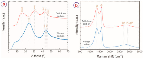 (a) XRD diffractograms and (b) Raman spectra of cellulose and Nomex-derived carbon sheets, suggesting turbostratic microstructure for both the materials, with a higher degree of crystallinity for Nomex-derived carbon material.