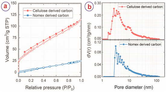 (a) Nitrogen adsorption-desorption isotherms and (b) pore size distribution of cellulose and Nomex-derived carbon sheets.