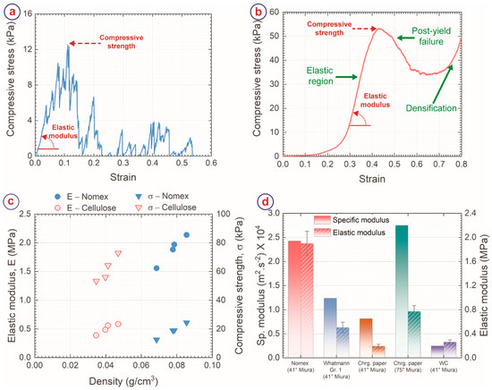 Stress-strain curve of (a) Nomex-derived carbon Miura-ori and (b) cellulose-derived carbon Miura-ori under a compressive load. The point of compression strength (σ) and definition of elastic modulus (E) were indicated in both the carbon samples. (c) Comparison of E and σ of the carbon Miura-ori samples against their structural density. (d) Comparison of E and specific modulus of different carbonaceous Miura-ori obtained from different precursor sheets. The data for chromatography (Chrg.) paper and WC were obtained from Ref. [18] and Ref. [16], respectively.