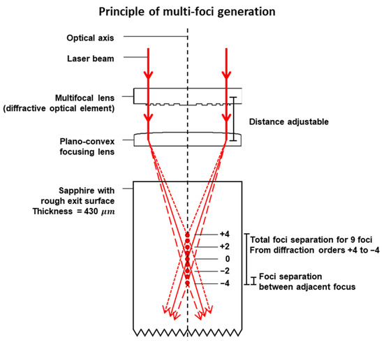 Multifocal optics has been employed with promising results to improve the stealth dicing of transparent materials. These include glasses and crystals of different thicknesses. Multi-foci laser irradiation distributes laser energy more evenly over the sample thickness with better controlled dicing. Current multi-foci laser dicing techniques generate multiple foci by employing concave mirrors [13], annular coaxial focusing lenses [14], and diffractive optical elements [15,16]. Allocating laser energy to multi-foci reduces the size of heat-affected zones and the extent of non-uniform distributions of thermal and mechanical stresses in the sample’s thickness, and hence reduces the possibility of crack formation [13,14,15,16]. These methods generally irradiate a transparent medium with a single laser scan only. It could be reasoned that introducing multi-foci for sample dicing could avoid the need for multiple laser passes.