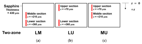 Schematic of two-zone scanning of one-third sections of wafer thickness with middle focus located at the indicated values for two-zone (a) LM (lower-middle sections), (b) LU (lower-upper sections), and (c) MU (middle-upper sections).