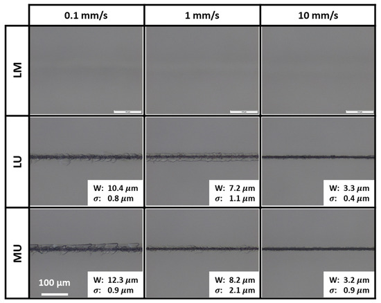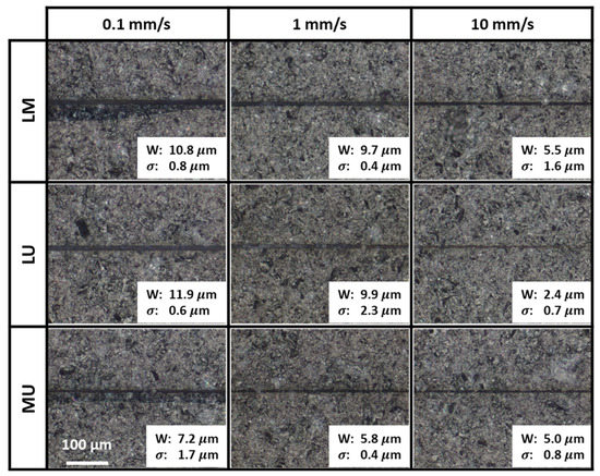 As LU first scanned the lower section close to the sample’s bottom surface, bottom surface scribes were detected for all scanning speeds; see Figure 4. The bottom surface ablation-dominated scribes were formed in a similar manner as those in LM. An increase in scanning speed caused a reduction of energy deposition and a reduction of the scribe width on the bottom surface as indicated in Figure 4.