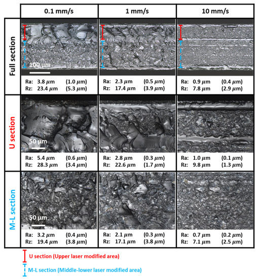 Sidewall profile laser-scanned images of cleaved MU samples at higher magnifications and roughness measurements Ra and Rz (with standard deviations). The solid red line indicates the upper laser-modified area; the dashed blue line indicates the middle-lower laser-modified area.