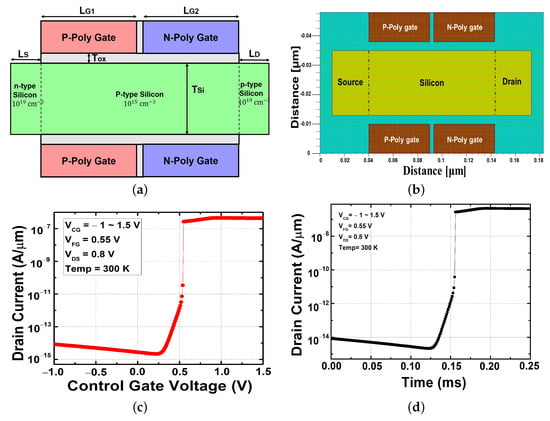 The important device parameters used in the simulation are listed in Table 1. Figure 1c shows the transfer characteristics of the device with the default device parameters. It can be seen that steep switching occurred at the place where the off-current region changed to the on-current region, and a sufficient on–off current ratio of 10 could be obtained. Additionally, as shown in Figure 1d, an extremely short time of within 25 s was required to change the off-state to on-state. This work represents an attempt to create structures utilizing commonly used materials to achieve a high performance. Thus, the device was made using silicon (Si) or silicon-product materials; specifically, for the source, drain, and channel we considered the use of Si with different doping types and concentrations. The gate dielectric material used was silicon dioxide (SiO), which was thought to be more reliable and compatible. However, it is expected that the optimization data obtained in this study can be applied even if the gate oxide is changed to a high-k dielectric.