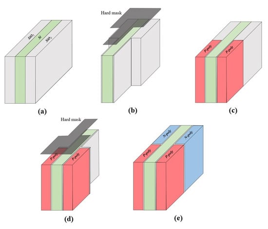 Figure 2 describes the approximate fabrication process used for the proposed FBFET device. It would have been hard to create the device using the conventional MOSFET fabrication process, since the device had two types of gate doped with n-type and p-type structures, respectively. Thus, it was necessary to form the n-type and p-type poly silicon gates separately. First, a fin-type silicon channel had to be prepared, as shown in Figure 2a. Subsequently, an iterative etching and deposition process was conducted two times, as shown in Figure 2b–e. A more intensive fabrication process was required for this compared with conventional MOSFET, but it was possible to achieve this with technology that already existed and the process was not expected to be complex.