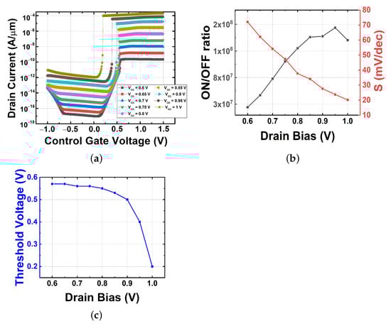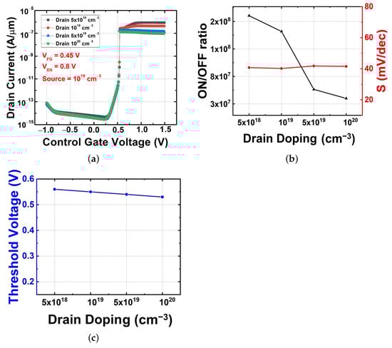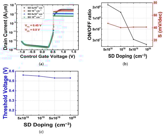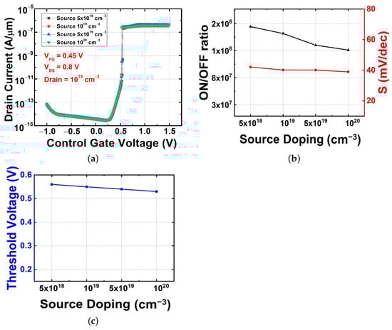 Figure 5a shows the transfer characteristics with regard to the influence of a source doping variation from 5 × 10 to 1 × 10 cm with the drain region set at 1 × 10 cm. Compared with the result shown in Figure 4, the effect of source doping on the on-current change was insignificant, as shown in Figure 5a. In Figure 5b, the change in S was similar to the previous one, and the change in the on-/off current ratio was relatively small. Therefore, we can expect that the change in source doping has a slight effect on the electron and hole barriers and a small effect on the energy band even in the ON region after feedback occurs. In particular, the small effect on the barrier that affects the switching characteristics is confirmed by a slight change in the threshold voltage, as shown in Figure 5c. Therefore, it can be concluded that the change in source doping does not significantly affect the change in electrical characteristics.