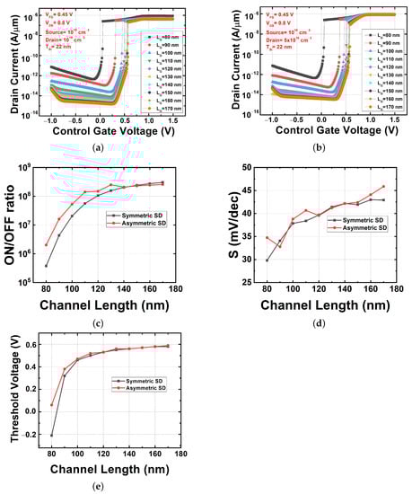 Electrical characteristics with channel length variation. (a) Transfer characteristics of symmetric source/drain FBFET, (b) transfer characteristics of asymmetric source/drain FBFET, (c) on–off current ratio in both FBFETs, (d) subthreshold swing in both FBFETs, and (e) threshold voltage in both FBFETs.