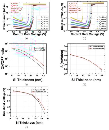 In the previous study, when S was obtained at a particular point, there was no significant change in S according to the channel thickness variation []. Similar to the previous results, a steep slope in the transition curve can be seen in Figure 4a,b. However, in this study where the average S was obtained, S decreased as the channel thickness increased, as shown in Figure 8d. The asymmetric-structure FBFET has similar S characteristics to those of the symmetric-structure FBFET. It can be seen that there was no significant difference between the two FBFETs even in terms of the V change, as shown in Figure 8e, which had the same pattern as the channel length variation. As shown in Figure 7 and Figure 8, the asymmetric FBFET was superior to the symmetric FBFET in terms of the on–off current ratio when the device dimensions were changed.