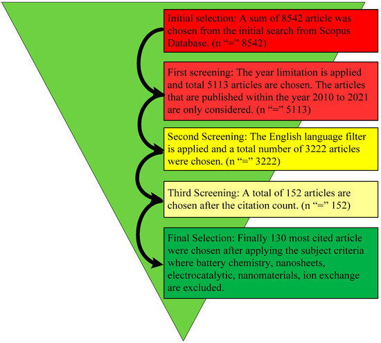 On the basis of the above strategy, and has already been stated, the manuscript was rearranged utilizing a sorting criterion known as, “time sighted–highest to lowest.” A filter was applied to the Scopus data to find the self-citations. Finally, the ultimate selection of appropriate articles was based on the titles, abstracts, and the contribution of the article to the field of MESS. This screening procedure is described in Figure 1.