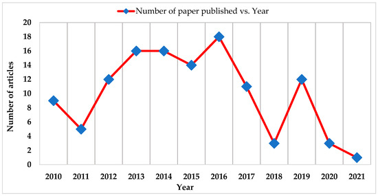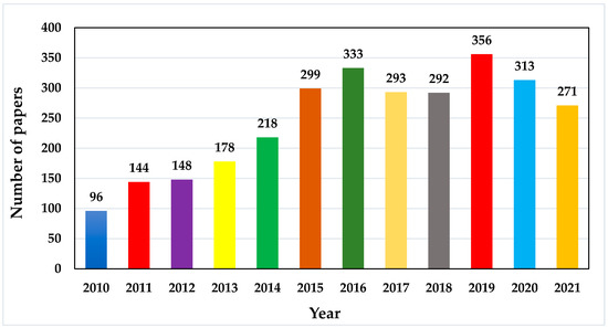 As reported by the Scopus database, the first article on MESS as a sort of RESs integration, was published in 1978 [43]. After this publication, many researchers suggested and designed different techniques of harvesting with RESs for the MESS. Figure 2 presents the research trends in this field from 2010 to 2021. It is clear from Figure 2 that the trend of research in the field of MESS increased remarkably from 2015 to 2021; 2157 articles were published representing 73.34% of the total published articles. On the other hand, only 784 articles were published in the four years from 2010 to 2014, which is 26.66% of the total published articles.