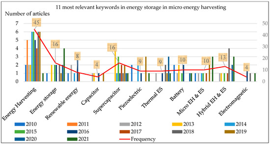 In Table 2, articles are selected based on 11 relevant, common keywords within the years 2010 to 2021. Based on the information presented in Table 2 the literature gaps and the research trend in the field of MESS as integration of RE could be highlighted. It is also clear from Table 2 that within the 11 relevant keywords, the highest common words are; “energy harvesting” followed by “renewable energy resources”, “hybrid EH and energy storage”, and “energy storage system”.