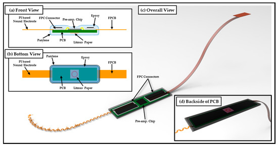 Scheme of polymer-based packaging for neural interface system. (a) Front view and (b) bottom view show details of packaging inside, (c) overall view, and (d) backside view.