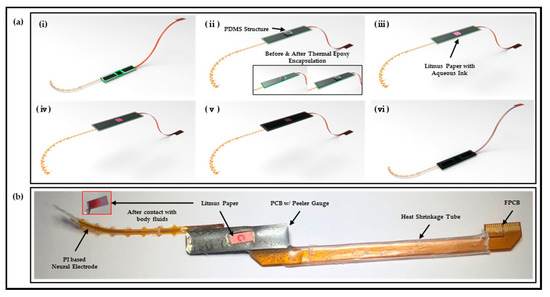 The detailed process of polymer-based packaging of the neural interface is shown in Figure 2a. The fabricated neural electrode and FPCB are individually connected with the PCB through FPC connectors (Molex 502078-3310 and Molex 502078-3760, Molex, Lisle, IL, USA), and the two FPC connectors are electrically connected to the pre-amplifier integrated on the PCB for each channel. In addition, a peeler gauge with a thickness of 50 μm was attached to the backside of the PCB for the convenience of visually checking leakage through litmus paper without any difficulty caused by the contrasting effect of red and green complementary colors (Figure 2a(i)). After integrating each component, encapsulation was performed using thermal epoxy in a state in which a rectangular parallelepiped PDMS (Polydimethylsiloxane, Dow Corning, Midland, MI, USA) structure, which is manufactured with a mixture ratio of 10:1 and a curing condition of 65 °C/1 h and was attached to the back of a PCB (Figure 2a(ii)). The recommendation of the curing condition of thermal epoxy by the manufacturer was 2 h at room temperature. However, it is possible to improve the adhesion between the thermal epoxy and polyimide by adjusting the curing conditions. It should be noted that all thermal epoxy curing processes have been done at 65 °C for 2 h. (Related information can be found in the Results in Section 3.2 and Section 3.3) PDMS has low mechanical strength and adhesion due to weak interactions between molecular chains and a lack of polar groups [26]. Various methods, such as phosphorus and boron synthesis, ultraviolet-ozone treatment, and an oxygen plasma treatment for improving adhesion, have been studied [27,28,29], but in this study, it is possible to easily remove the PDMS structure after curing the thermal epoxy due to the low adhesion of PDMS. Thereafter, square-shaped litmus paper with a circle pattern with an aqueous marker was attached at the corresponding position, and additional encapsulation was carried out using thermal epoxy (Figure 2a(iii,iv)). The entire thickness of the applied thermal epoxy was approximately 2 mm, and the electrode sites of the neural electrode and the metal electrode of the FPCB for electrical connection were covered with a stretchable polymer film (Parafilm, Bemis Company, Inc., Neenah, WI, USA), and a parylene layer of thickness of 5 μm was deposited using a commercial parylene deposition instrument (Figure 2a(v)). After parylene deposition, the stretchable polymer film was removed and the mechanical rigidity was reinforced on FPCB using a heat-shrink tube to complete the manufacturing of the prototype as shown in Figure 2a(vi),b.