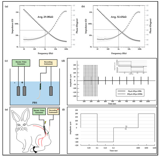 The results of impedance measurements of (a) neural electrode for in vitro experiment and (b) neural electrode for in vivo experiment. Electrophysiological experiment setup and stimulation parameters. (c) In vitro experiment setup in PBS, (d) a couple of stimulation parameters, (e) in vivo experiment setup with New Zealand white rabbit, and (f) in vivo stimulation parameters.