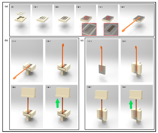 Procedures of adhesion evaluation test sample preparation. (a) Process of sample preparation with uniform adhered area between epoxy and FPBC; (a-i–a-ii) preparation and assembly of 3D-printed sample holder; (a-iii) filling and curing epoxy into vacancy of sample holder; (a-iv) covering epoxy surface with detachable tape excluding uniform area; (a-v) additional epoxy filling and squeezing epoxy into uncovered area; and (a-vi) applying FPCB to uncured epoxy and curing. (b) Tear-test procedures. (c) Shear-test procedures.
