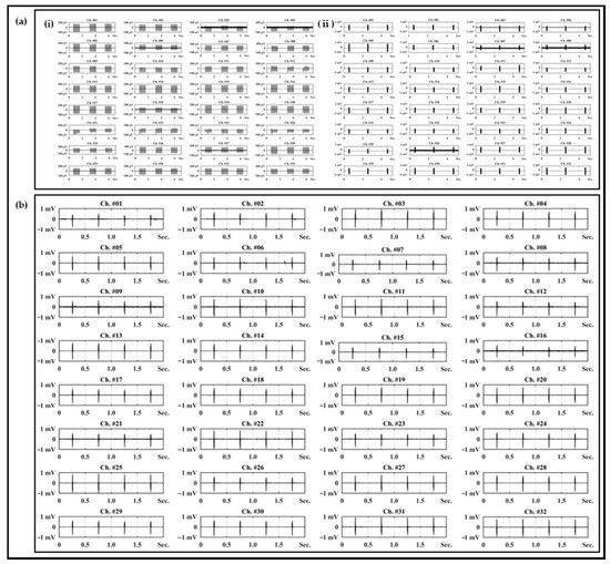 In vitro and in vivo experiments were conducted to verify whether there was a sufficiently applicable performance of the neural interface to which the polymer-based packaging was applied or not. In order to verify the signal acquisition performances of the neural interfaces to be used before the relevant experiment, the impedance at each frequency was measured using electrochemical impedance spectroscopy. The impedances of a total of two neural interfaces were measured, and each measurement result exhibited an average 29.08 kOhm and 32.63 kOhm at 1 kHz. This is a sufficient impedance value suitable for acquiring a neural signal, and the standard deviation of each average impedance was simultaneously analyzed to be 5.02 kOhm and 8.17 kOhm; thus, it was also verified that it had stability. In addition, the neural interface obtained from the measurement result of Figure 3a was used for in vitro experiment, and the neural interface with the impedance of Figure 3b was used for in vivo experiment, respectively. As shown in Figure 3c, the in vitro experiments were configured in a state in which the anode/cathode electrodes, which were connected to the electric pulse generator (HSE-HA stimulator CS for isolated cells, Hugo Sachs Elektronik Harvard Apparatus GmbH, Baden-Württemberg, Germany), and the neural interface and reference electrode, which were connected to the neural signal acquisition equipment (RHS stim/recording system, Intan Technologies, Los Angeles, CA, USA), were immersed in a PBS solution. This experiment was a process to verify the performance and capability of the neural interface that acquired the artificial signal generated through an electric pulse generator, and the stimulation parameter was constructed based on the criteria of the general neural stimulation parameter [30,31,32]. As shown in Figure 3d, the stimulus parameters were composed of two types (50 μA-100 μs-10 Hz and 200 μA-100 μs-100 Hz). In addition, the corresponding stimulation signal generated by the electrical pulse generator was acquired and recorded in real time from a total of 32 channel electrodes using a neural signal acquisition device.