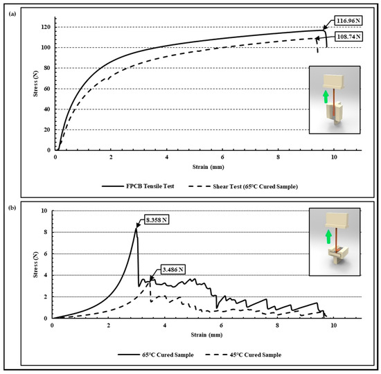 The results of the tear force and shear force experiments conducted for the evaluation of the interface adhesion between the thermal epoxy and FPCB are as shown in Figure 6. When shear force is applied to a sample manufactured under a curing condition of 65 °C/2 h, the FPCB is not separated from the thermal epoxy; rather, it fractures at the middle point of the FPCB. As shown in the graph of Figure 6a, the measurement results of the shear forces are similar or higher to the tensile strength of the FPCB itself. It means that the sheer force experiment is not suitable for the evaluation of the interfacial adhesion between the thermal epoxy and the FPCB (polyimide) because the FPCB can be deformed or fractured before detaching it. Conversely, in the tear force experiment, it was verified that the FPCB was separated from the thermal epoxy based on 3.486 N and 8.358 N, respectively, in the samples prepared under curing conditions of 45 °C/2 h and 65 °C/2 h. As a result, in the situation with the same physically adhered interface conditions, it was evaluated that the interfacial adhesion differed more than twice in accordance with the curing conditions of the thermosetting epoxy.