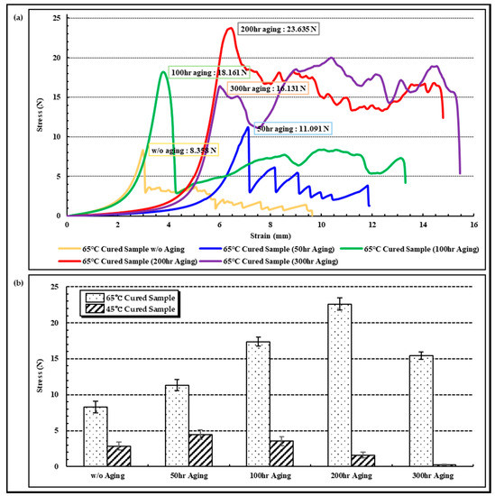 Results of acceleration aging test in 65 °C PBS solution at 50, 100, 200, 300 h. (a) Results of tear test of 65 °C cured sample after each aging time and (b) maximum tear force comparison between 45 °C and 65 °C cured samples.