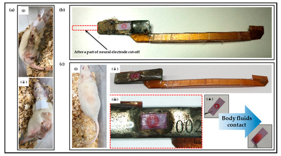 To verify the practical applicability of fabricated neural interfaces to which polymer-based packaging was applied, in vivo experiments were constructed. Neural electrodes were inserted into rats’ sciatic nerves, and sites, including PCB and FPCB, were placed in the rats’ hind leg muscles and subcutaneously. Insertion surgeries were performed on a total of two individual rats, and the electrodes were extracted at the times of 8 months and 18 months after implantation to check for changes in the conditions of the overall polymer-based packaging, especially applied litmus papers. At the time of extractions, it was difficult to separate the neural electrodes from the sciatic nerves, so the neural electrodes were cut and extracted.