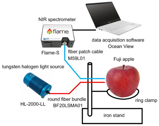 Figure 1 shows the sugar content measurement setup using an NIR spectrometer. We used a tungsten halogen light source (HL-2000-LL) and an NIR spectrometer (Flame-S), both from Ocean Insight, Inc (Geograaf 24 6921 EW Duiven, Nederland). [3]. Light from the source is sent to the surface of apples through a round fiber bundle (BF20LSMA01), which consists of 7 optical fibers with a 550 um core diameter, and diffuse reflected light from the apples is sent back to the NIR spectrometer through a fiber patch cable (M59L01), which is a single optical fiber with a 1 mm core diameter. Both are from Thorlabs, Inc (WG40530 and WG41050, Ely, UK). [4]. An apple is firmly placed on a ring clamp that is connected to an iron stand as shown in Figure 1.