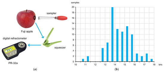 (a) Direct sugar content measurement setup using a digital refractometer and (b) distribution of measured sugar content values.