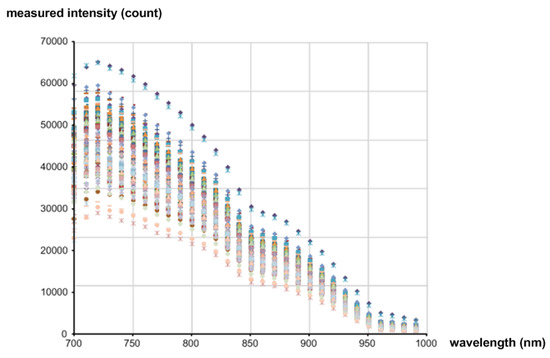 The tungsten halogen light source emits visible (VIS) to NIR light over a broad range of 360 nm–2000 nm wavelengths, and the NIR spectrometer has a wavelength resolution of 0.2 nm and an ADC resolution of 16b. In this measurement, to reduce the necessity of processing redundant data, we utilized only 31 wavelengths, which were evenly spaced in increments of 10 nm over the range of 700 nm–1000 nm.