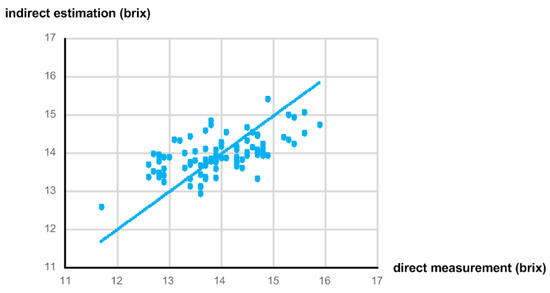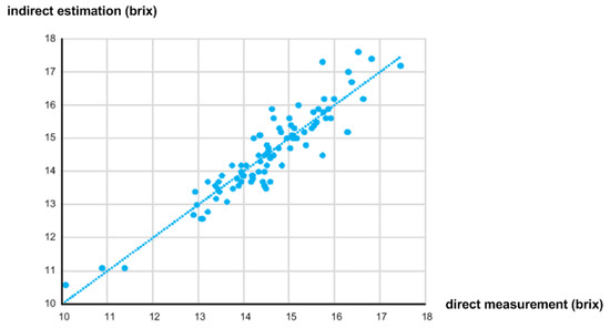where is the estimated sugar content, is the fitted value of , is the mean value of , n is the number of samples, and p is the number of coefficients in the estimation model [7], they were calculated as 0.846 and 0.475 brix, respectively.