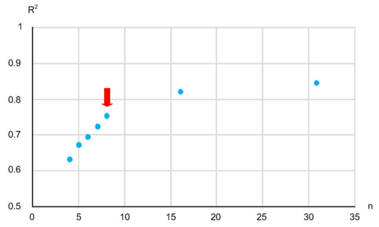 For this goal, we estimated the sugar content value by using a linear combination of the absorbance values calculated from the measured light intensities at 31 different wavelengths that were evenly spaced in increments of 10 nm over the range of 700 nm to 1000 nm by adopting the MLR technique [7]. Then, we compared the R2 between the estimated sugar content value and the measured sugar content value while decreasing the number of wavelengths from 31 to 16, 8, 7, 6, and so on. Figure 6 shows the tendency of the measured R2 against the number of wavelengths. The R2 was measured as 0.846, 0.822, and 0.754 when n was 31, 16, and 8, respectively. It dropped abruptly when n decreased to less than 8. Thus, we determined the minimum required number of wavelengths to be 8, considering the hardware complexity of the implemented NIR spectroscopy module that should be mounted on a printed circuit board (PCB) with the same number of off-chip LEDs. The selected wavelengths were 720 nm, 750 nm, 780 nm, 810 nm, 840 nm, 870 nm, 910 nm, and 940 nm. In this paper, we selected only the wavelengths that were evenly distributed in increments of 30 nm. This was due to the restricted availability of the LEDs at different wavelengths. However, the performance of the NIR spectroscopy module could be improved if we select the optimum wavelengths by following the appropriate feature selection approach for the purpose of maximizing the R2 given a number of wavelengths.