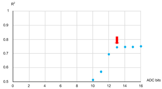Then, we repeated the estimation process using the MLR technique again while decreasing the resolution of the diffuse reflected light intensities that were initially obtained using a 16b ADC of the NIR spectrometer 1b by 1b starting from 16b. We could reduce the ADC resolution by erasing the least significant bit (LSB) of the measured light intensities 1b by 1b at a time. Figure 7 shows the measured R2 versus the ADC resolution from 16b to 10b. Since the tendency of the measured R2 shows that the estimation accuracy degraded abruptly at the resolution of 12b, we determined the minimum required ADC resolution to be 13b as shown in Figure 7.